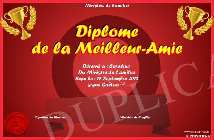 Envoyez par email votre Diplôme de la Meilleur-Amie personalisé