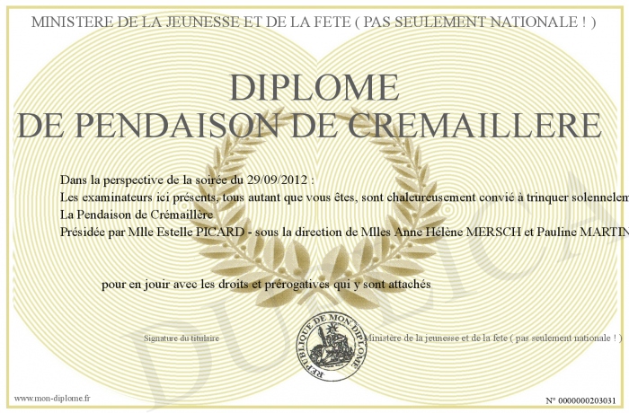 Envoyez par email votre Diplôme de Pendaison de Crémaillère personalisé