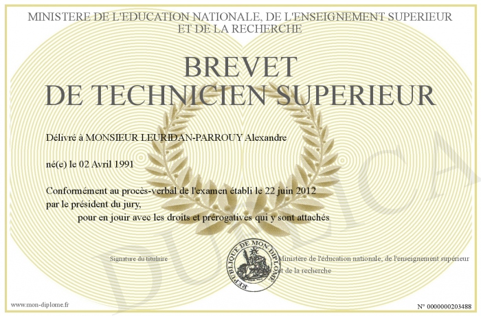 Envoyez par email votre brevet de technicien supérieur personalisé