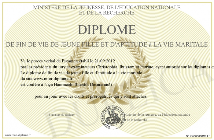 Envoyez par email votre Diplôme de fin de vie de jeune fille et d'aptitude à la vie maritale personalisé
