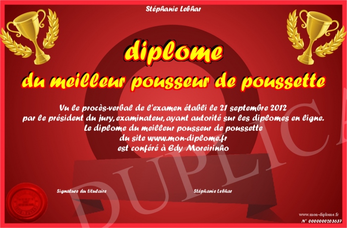 Envoyez par email votre diplôme du meilleur pousseur de poussette personalisé