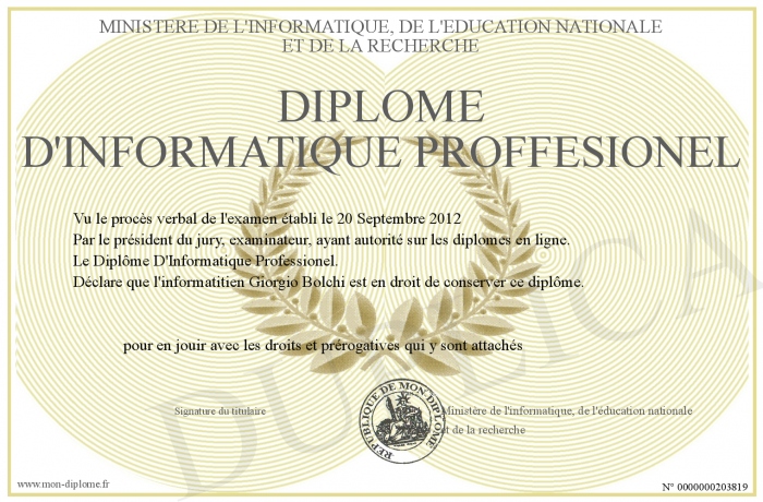 Envoyez par email votre Diplôme D'Informatique Proffesionel personalisé