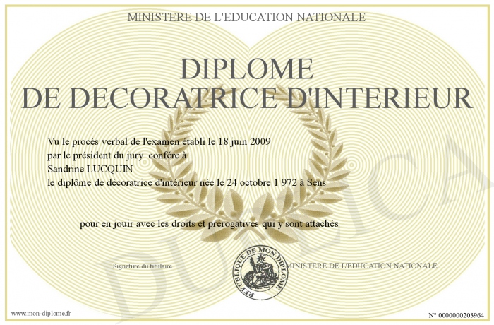 Envoyez par email votre Diplôme de décoratrice d'intérieur personalisé