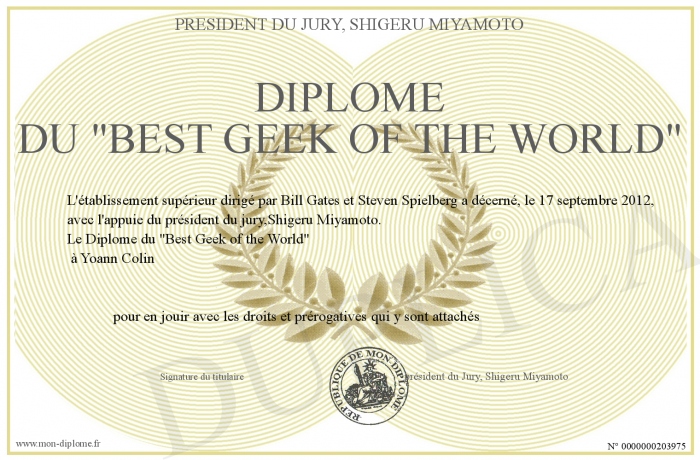 Envoyez par email votre Diplome du -Best Geek of the World- personalisé