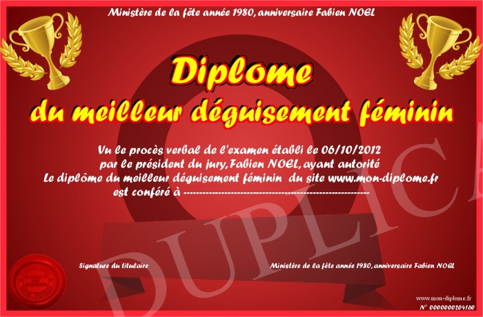 Envoyez par email votre Diplome du meilleur déguisement féminin personalisé