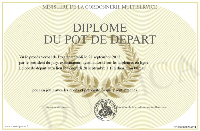Envoyez par email votre Diplôme du Pot de Départ personalisé