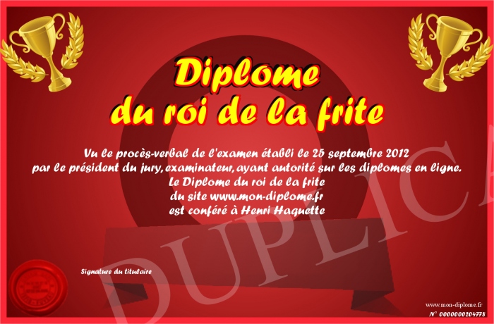 Envoyez par email votre Diplôme du roi de la frite personalisé