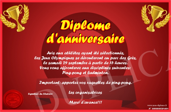 Envoyez par email votre Diplôme d'anniversaire personalisé