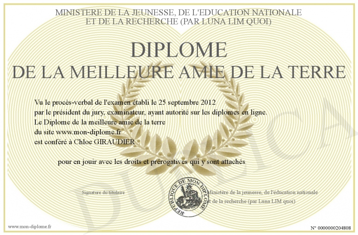 Envoyez par email votre Diplôme de la meilleure amie de la terre personalisé