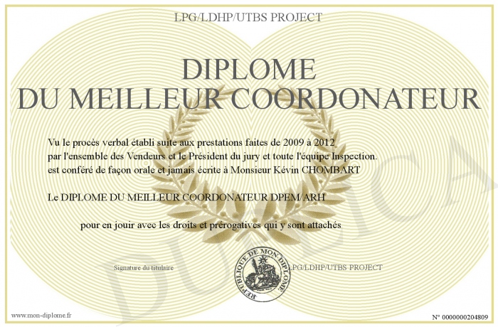 Envoyez par email votre Diplome du meilleur coordonateur personalisé