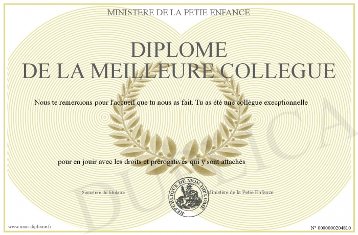 Envoyez par email votre Diplôme de la meilleure collègue personalisé
