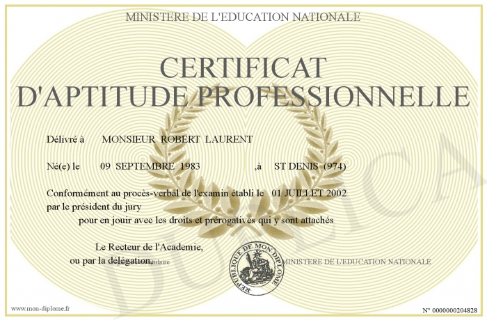 Envoyez par email votre CERTIFICAT D'APTITUDE PROFESSIONNELLE personalisé