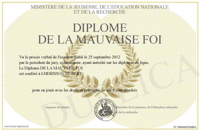 Envoyez par email votre Diplôme DE LA MAUVAISE FOI personalisé