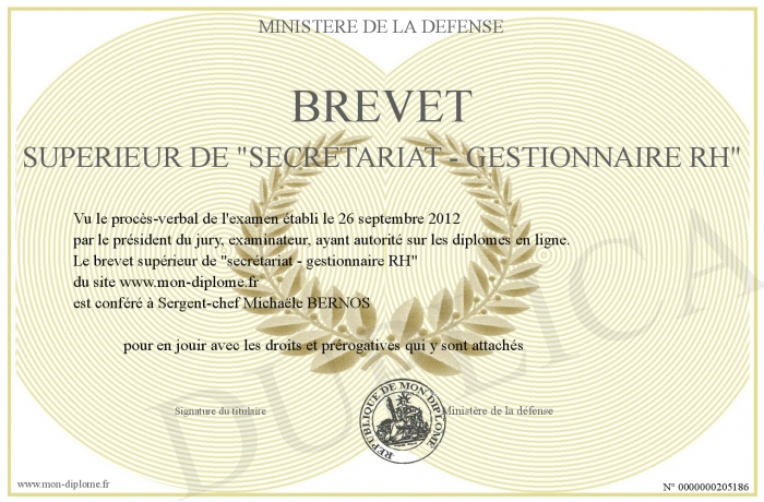 Envoyez par email votre brevet supérieur de -secrétariat - gestionnaire RH- personalisé