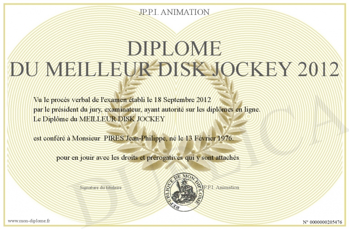 Envoyez par email votre Diplôme du meilleur Disk Jockey 2012 personalisé
