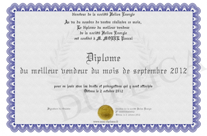 Envoyez par email votre Diplôme du meilleur vendeur du mois de septembre 2012 personalisé