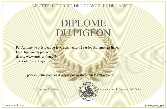 Envoyez par email votre Diplome du pigeon personalisé