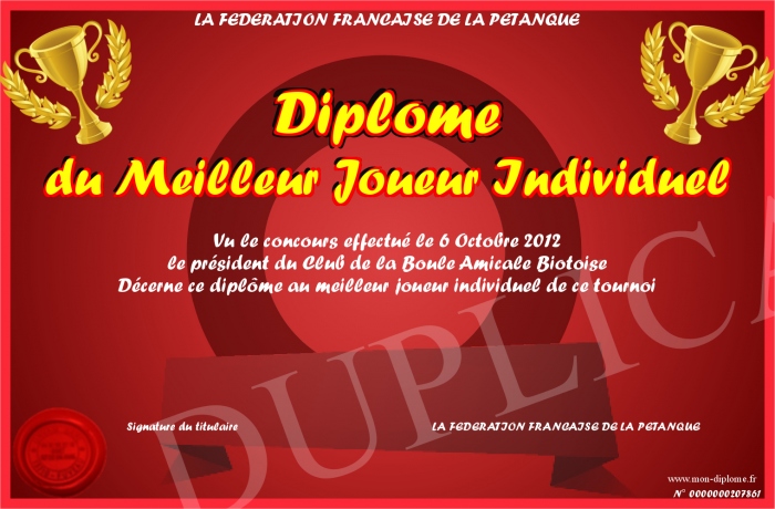 Envoyez par email votre Diplôme du Meilleur Joueur Individuel personalisé