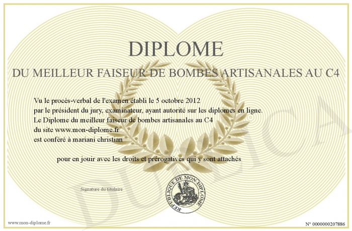 Envoyez par email votre Diplôme du meilleur faiseur de bombes artisanales au C4 personalisé