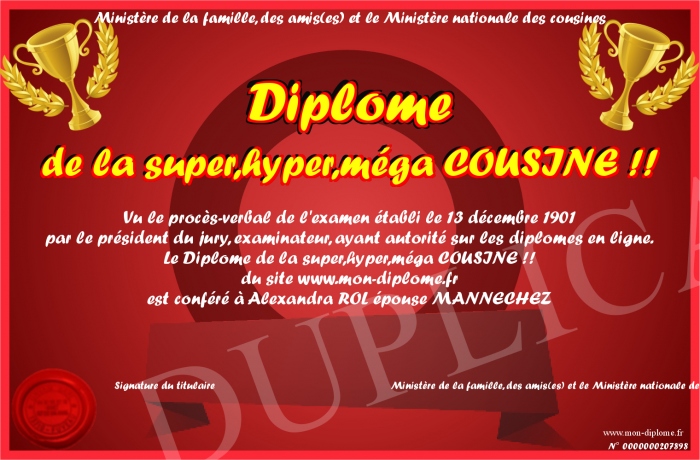 Envoyez par email votre Diplôme de la super,hyper,méga COUSINE !! personalisé