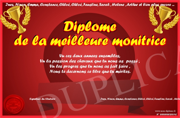 Envoyez par email votre Diplôme de la meilleure monitrice personalisé