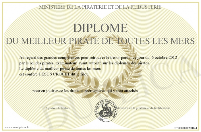 Envoyez par email votre Diplôme du Meilleur pirate de toutes les mers personalisé