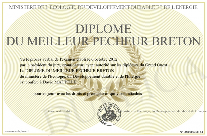 Envoyez par email votre DIPLOME DU MEILLEUR PECHEUR BRETON personalisé