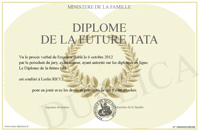 Envoyez par email votre Diplôme de la future tata personalisé