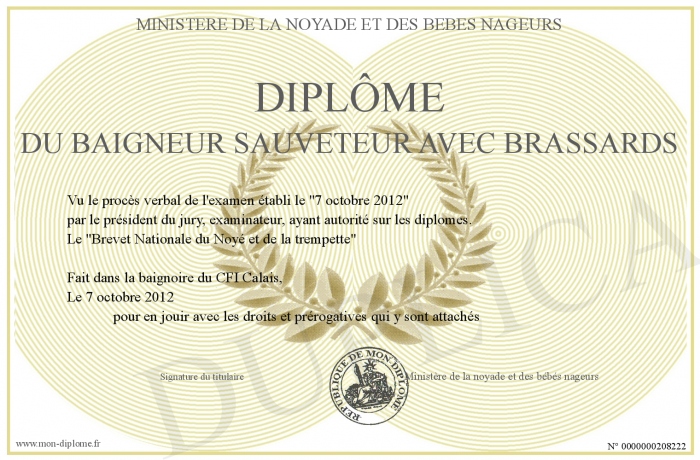 Envoyez par email votre DIPLÔME DU BAIGNEUR SAUVETEUR AVEC BRASSARDS personalisé