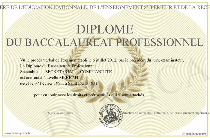 Envoyez par email votre Diplôme du Baccalaureat Professionnel personalisé