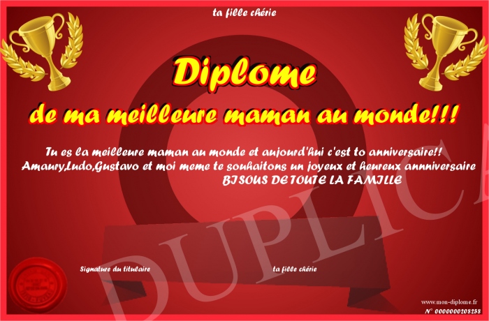 Envoyez par email votre Diplome de ma meilleure maman au monde!!! personalisé