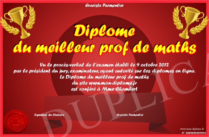 Envoyez par email votre Diplôme du meilleur prof de maths personalisé