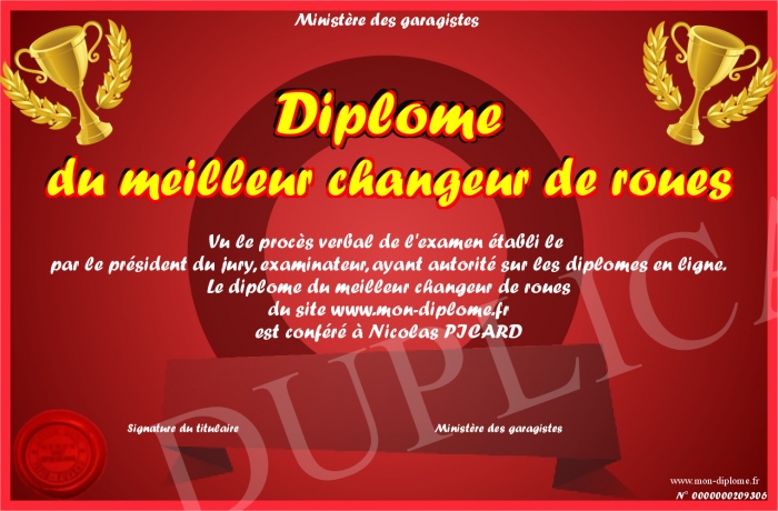 Envoyez par email votre Diplôme du meilleur changeur de roues personalisé