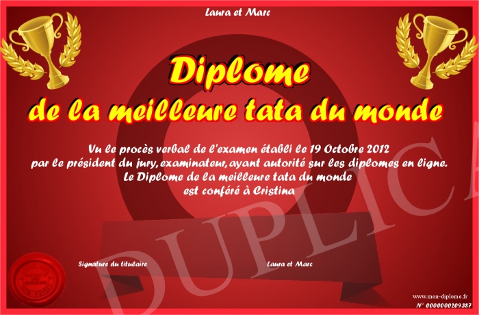Envoyez par email votre Diplôme de la meilleure tata du monde personalisé