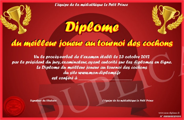 Envoyez par email votre Diplôme du meilleur joueur au tournoi des cochons personalisé
