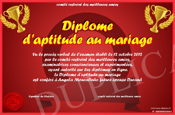 Envoyez par email votre Diplome d'aptitude au mariage personalisé