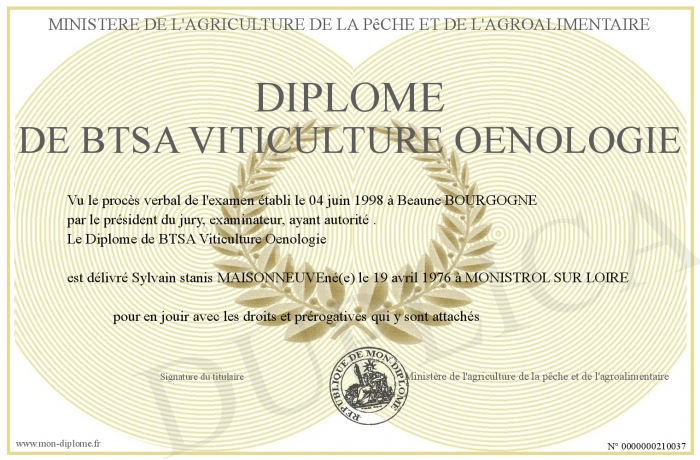 Envoyez par email votre Diplome de BTSA Viticulture Oenologie personalisé