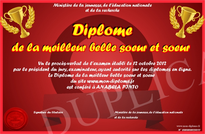 Envoyez par email votre Diplôme de la meilleur belle soeur et soeur personalisé