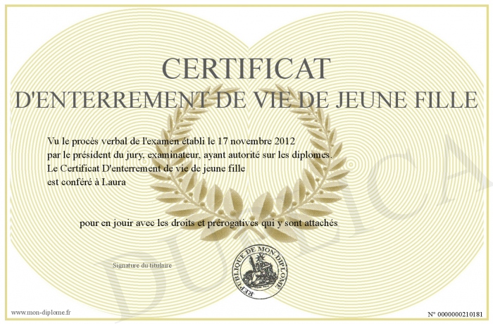 Envoyez par email votre Certificat D'enterrement de vie de jeune fille personalisé