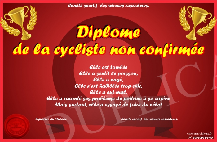 Envoyez par email votre Diplôme de la cycliste non confirmée personalisé