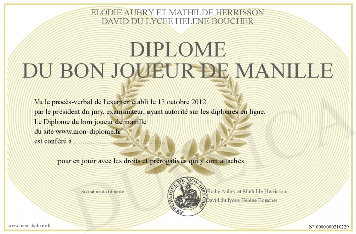 Envoyez par email votre Diplôme du bon joueur de manille personalisé