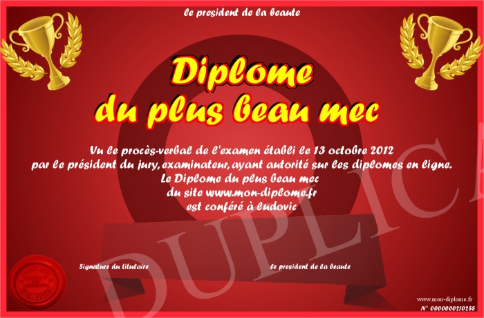 Envoyez par email votre Diplôme du plus beau mec personalisé