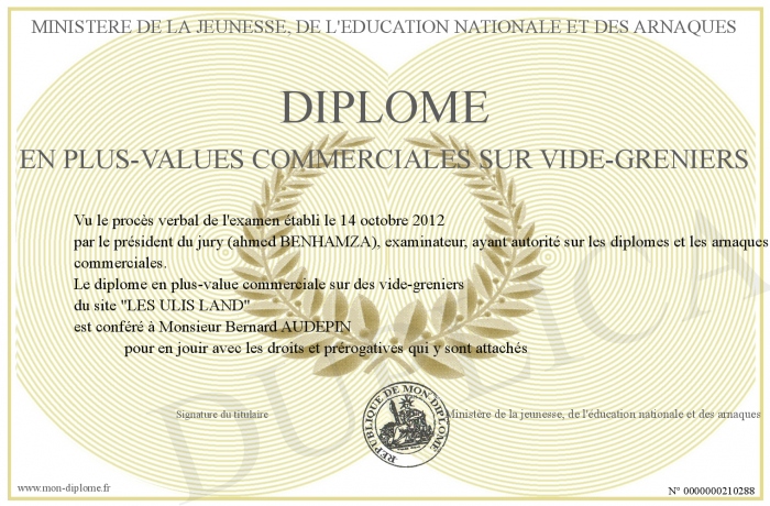 Envoyez par email votre Diplome en plus-values commerciales sur vide-greniers personalisé