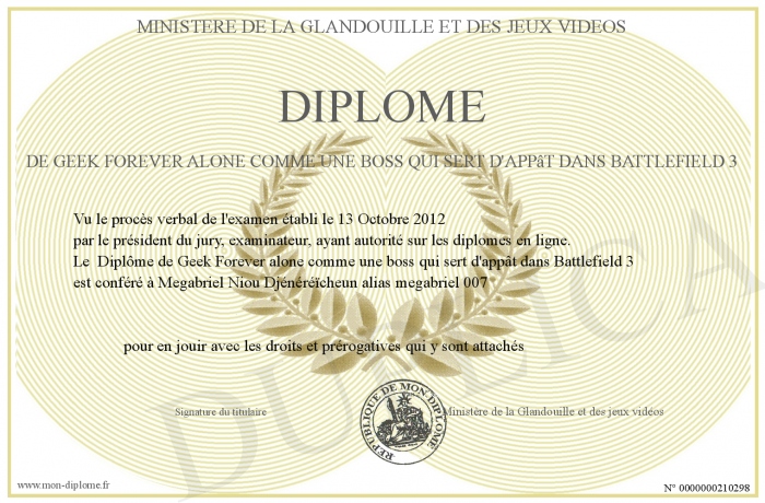 Envoyez par email votre Diplôme de Geek Forever alone comme une boss qui sert d'appât dans Battlefield 3 personalisé