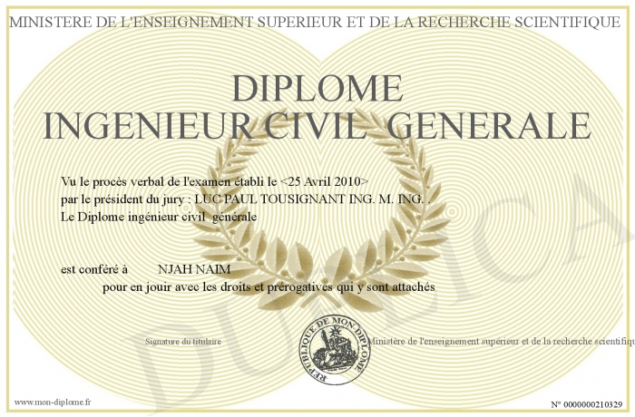 Envoyez par email votre Diplôme ingénieur civil générale personalisé