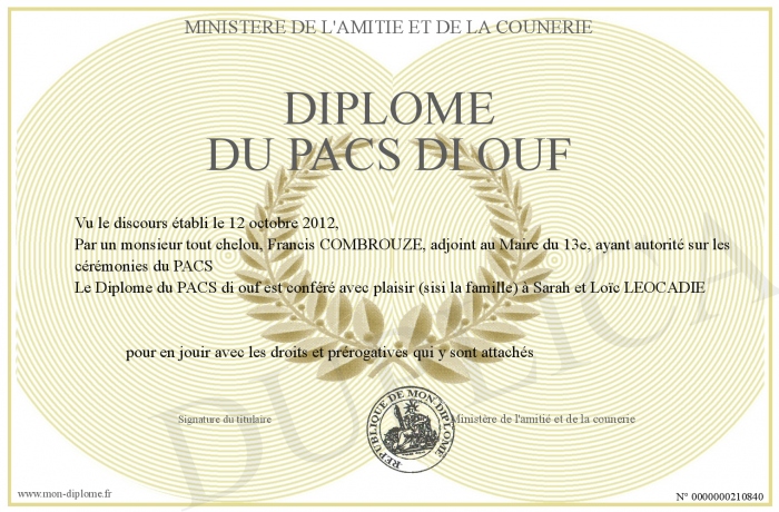 Envoyez par email votre Diplôme du PACS di ouf personalisé