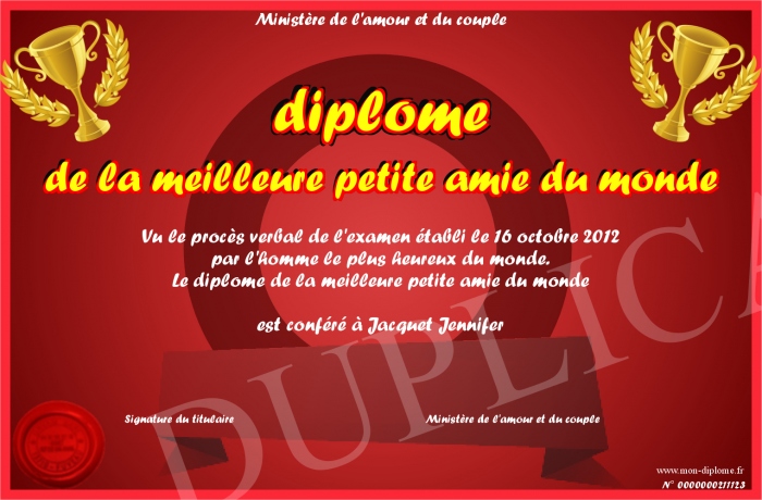 Envoyez par email votre diplome de la meilleure petite amie du monde personalisé