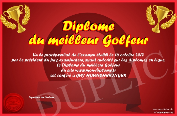 Envoyez par email votre Diplôme du meilleur Golfeur personalisé
