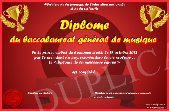 Envoyez par email votre Diplôme du baccalaureat général de musique personalisé