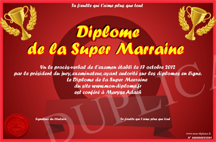 Envoyez par email votre Diplôme de la Super Marraine personalisé